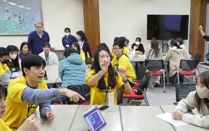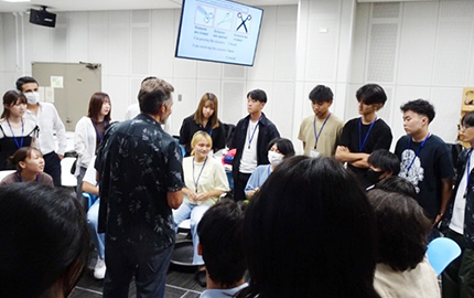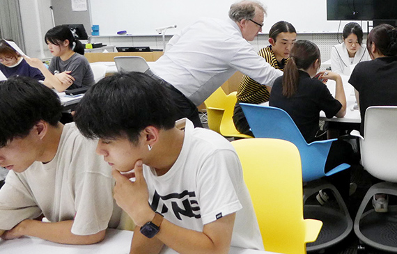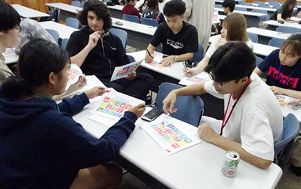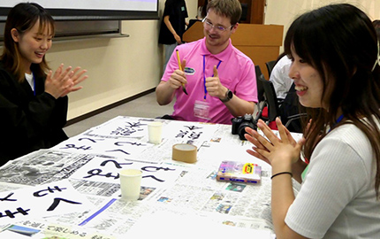 英語運用能力を高めることを目的に、英語漬け環境で短期集中的に英語を学ぶ、全学のプログラム「Intensive English」(夏季英語合宿)。講義やディスカッションだけでなく、留学生と一緒に行うゲームやパフォーマンスなどで異文化理解を深めます。