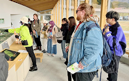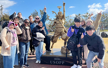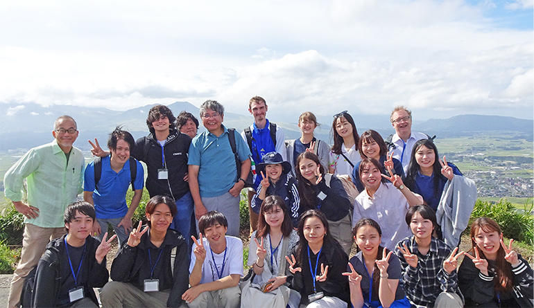 2023年11月に、留学生に日本及び熊本の地理や文化について学んでもらうことと、日本人学生の英語力向上のため、留学生(モンタナ州立大学ビリングスからの交換留学生、インドネシア・ガーナからの水銀研究留学生)4名、日本人学生で阿蘇ツアーを開催し交流を深めました。