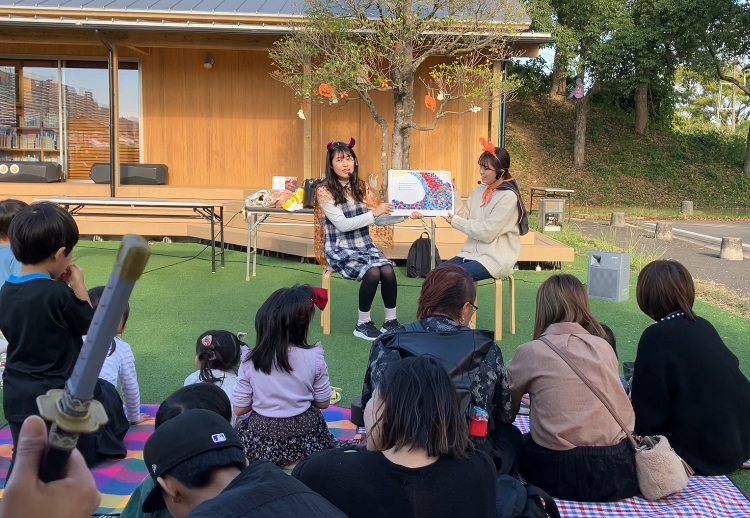 屋外での開催でしたが天候にも恵まれ、とても温かい雰囲気の中、英語の歌、ダンス、クイズを交えて、計4冊の英語の絵本を読みました。