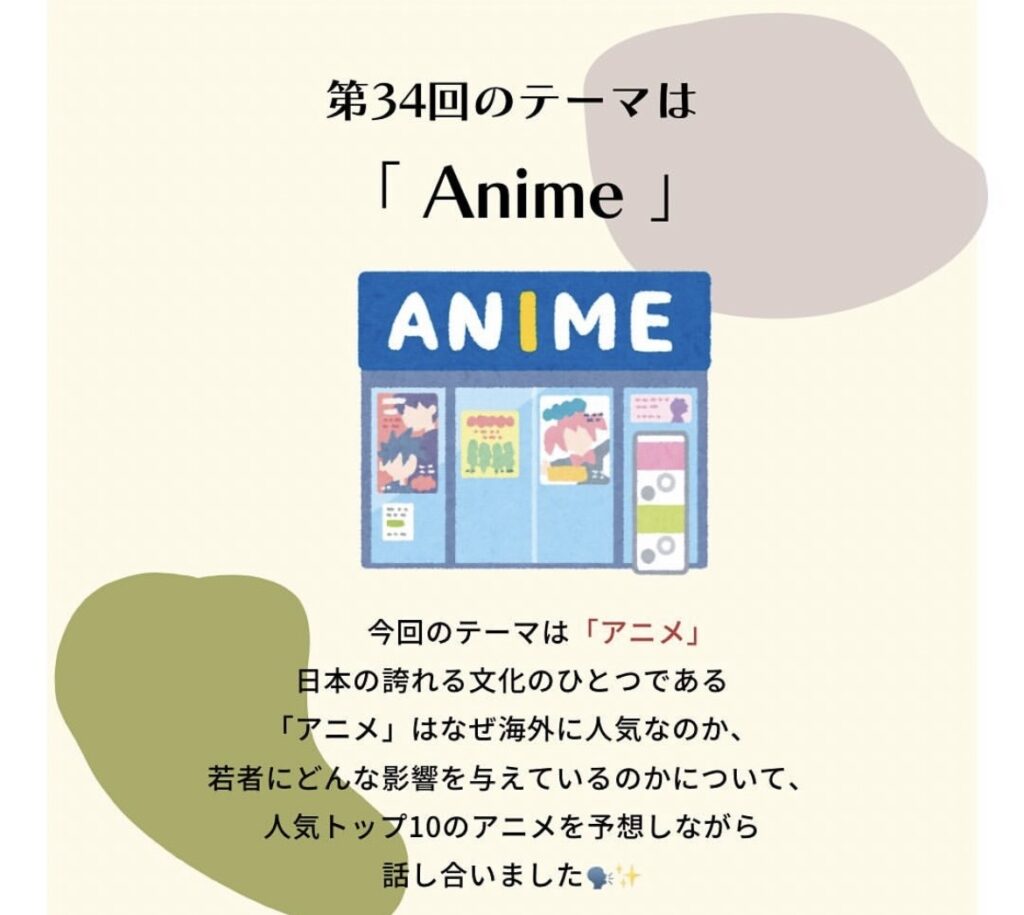 今週のトピックは、“Japanese Anime”。皆さんは、好きなアニメはありますか?海外でも大人気な日本のアニメは、莫大な経済効果をもたらしています。アニメを通して、海外の人と会話が盛り上がったり、仲良くなった経験がある人も多いと思います!日本のアニメ文化がなぜ人気なのか、人気アニメトップ10を予想しながら、ゆるく話し合いました。