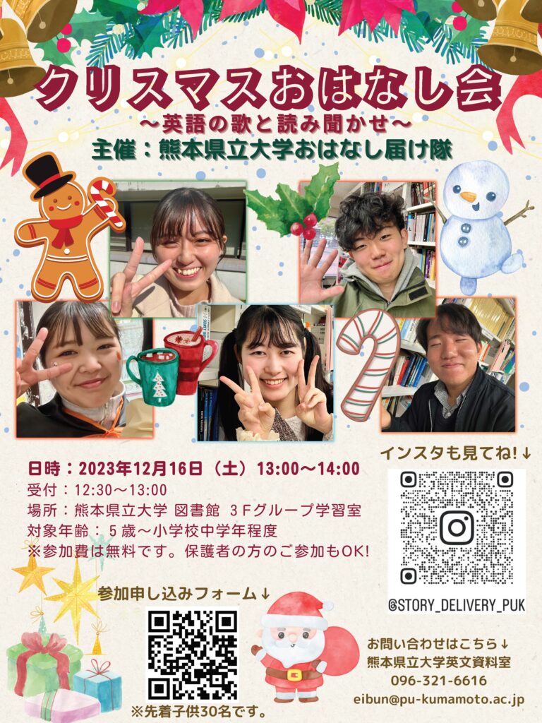 おはなし届け隊が熊本県立大学図書館にて、下記の英語読み聞かせのイベントを実施します。 お申込みはこちらまで (先着30名様)。皆さんにお会いできるのを楽しみにしています! この記事をシェアする シェア Tweet