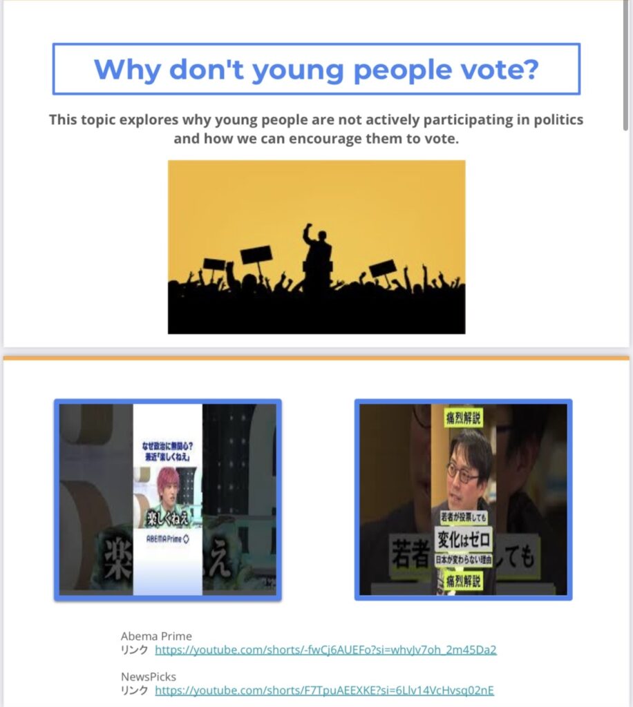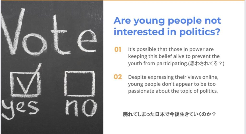 今週のトピックは、“Why Don’t Young People Vote”です。選挙があるたびに「若者の政治離れ」という言葉を耳にしますが、その理由は一体何でしょうか?政治に「関心がない」から? 投票しても「自分の1票では何も変わらない」とあきらめているから? それとも、若者の意見を政治がほとんど聞いてこなかったことが、無力感を生み出しているからなのか。そんな疑問やモヤモヤを、みんなで話し合いました!
