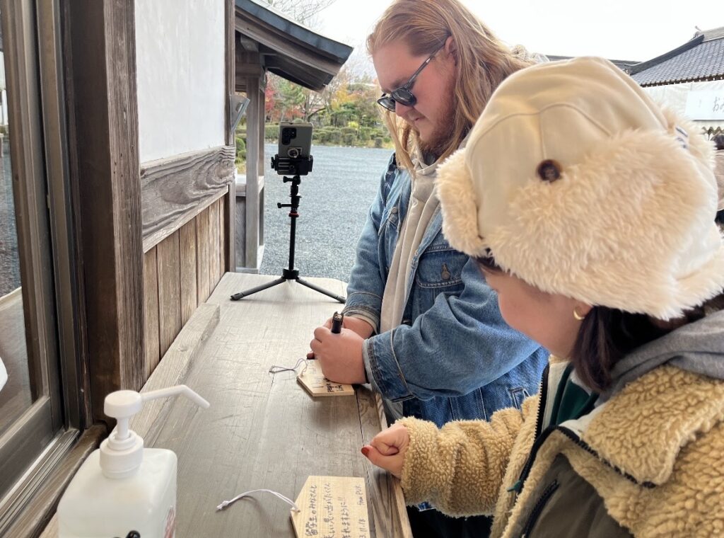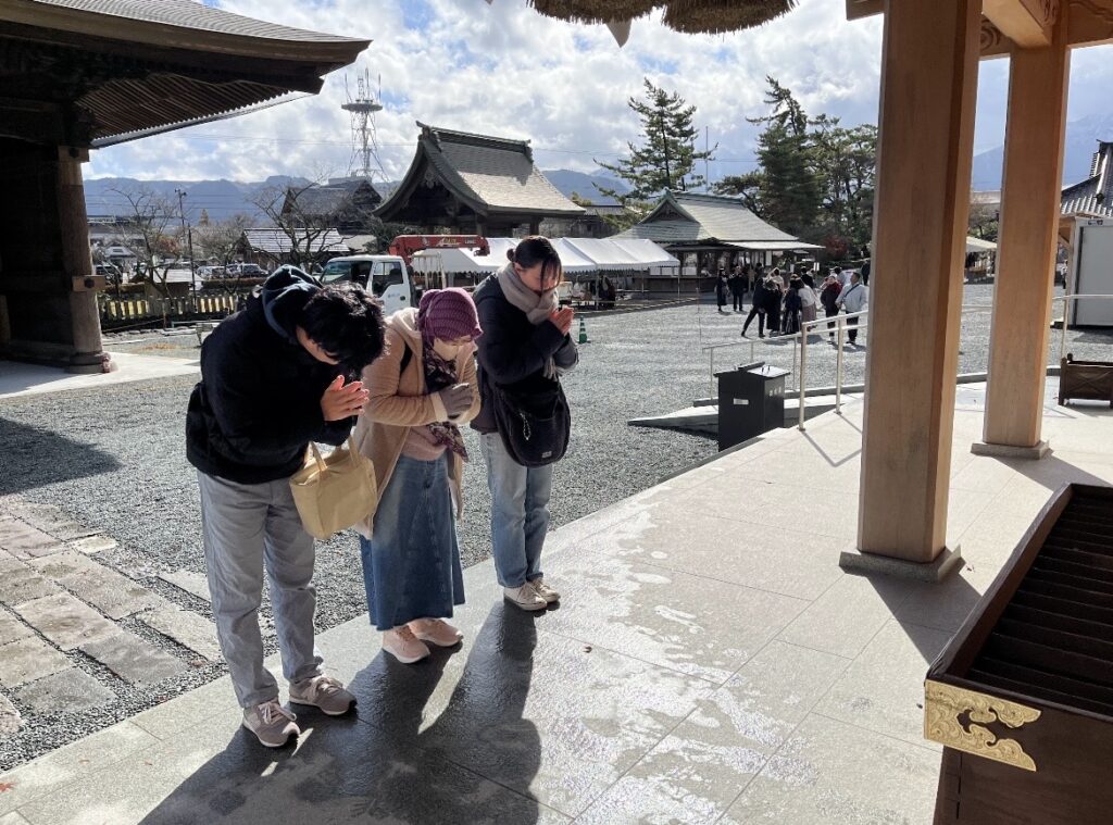まず貸切バスで阿蘇神社に行きました。英語英米文学科の学生が、神社の特徴や歴史を事前に調べ、英語で留学生に解説しました。お守りやおみくじを英語で説明するのは、難しく、自国の文化を改めて考える機会になりました。留学生も興味を持ち、絵馬を手に取る人もいました。