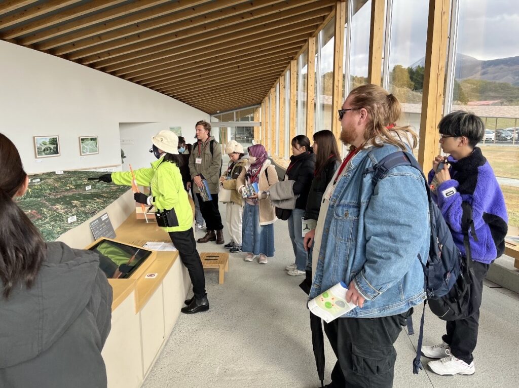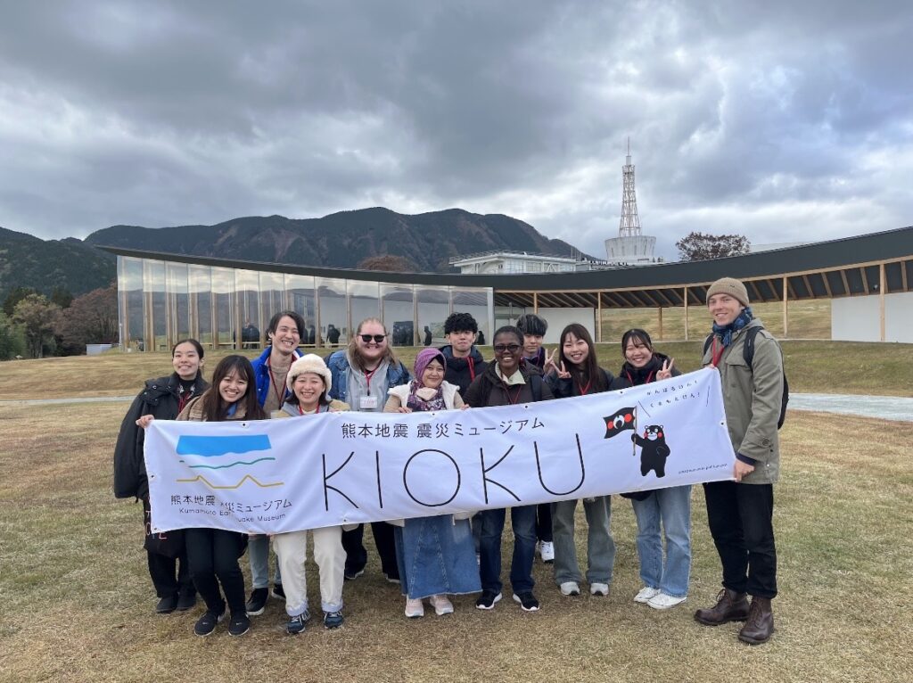 その後、熊本地震震災ミュージアムと白川水源を訪れました。熊本地震震災ミュージアムでは、2016年の地震後の様子を捉えた映像を見て、地震を経験したことがない留学生や、当時熊本にいなかった学生も被害の大きさや実態を知ることができました。白川水源では、湧き水や清流の美しさを紹介することができ、熊本の誇る美味しい水を一緒に味わうことができました。