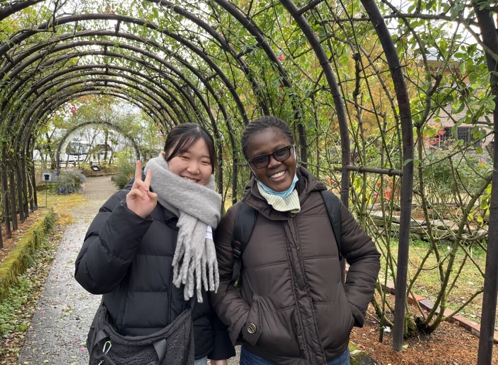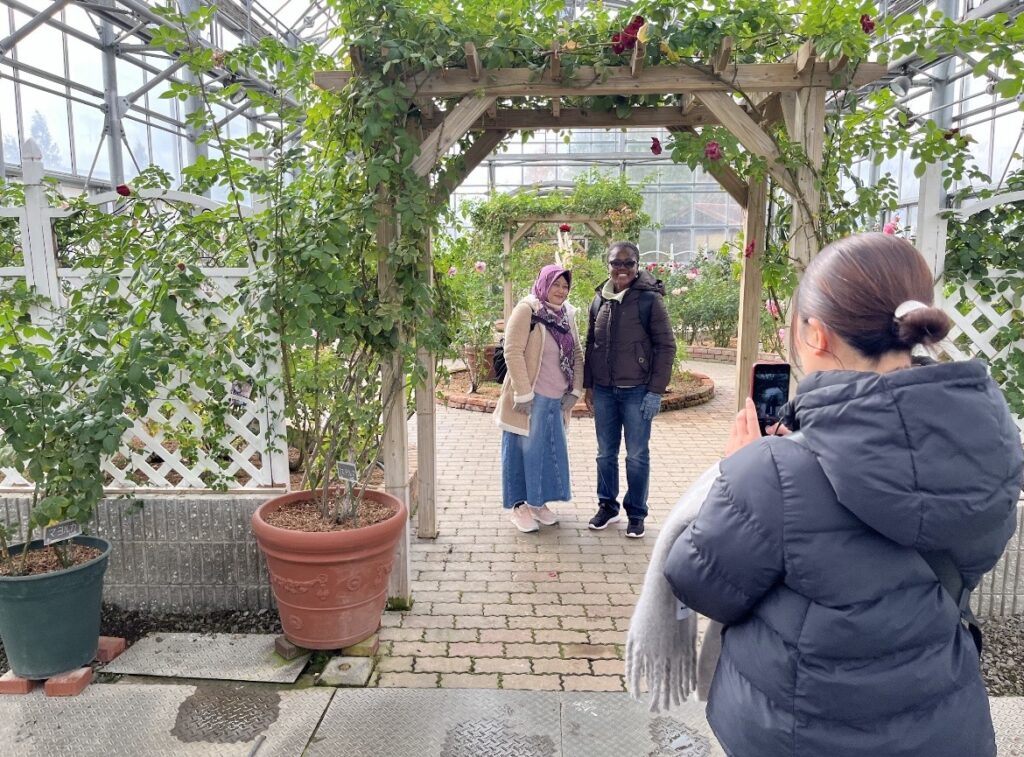 次に、バラ園を訪れました。色とりどりのバラに目を奪われ、写真を撮りました。花言葉を知る留学生もいて、驚きました。