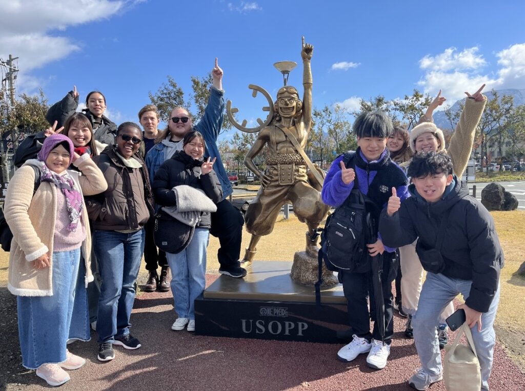 このツアーの目的は、留学生に日本及び熊本の地理や文化について学んでもらうことと、日本人学生の英語力向上でした。萱嶋先生引率のもと、留学生4名、英文科の学生7名、計11名が参加しました。