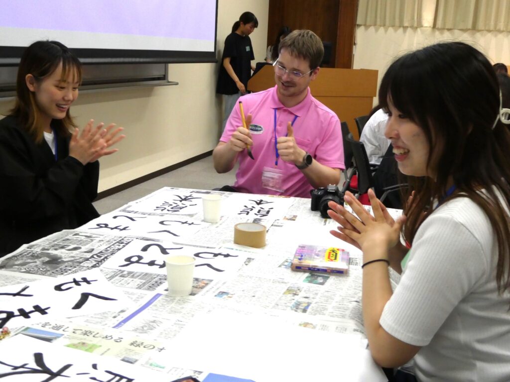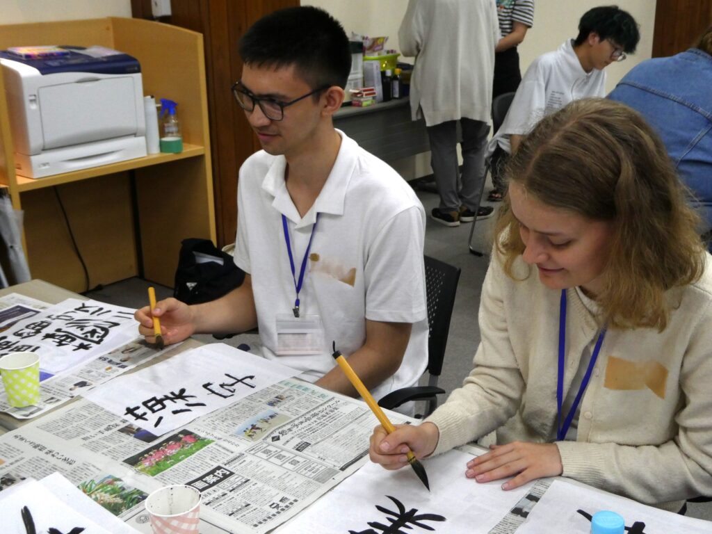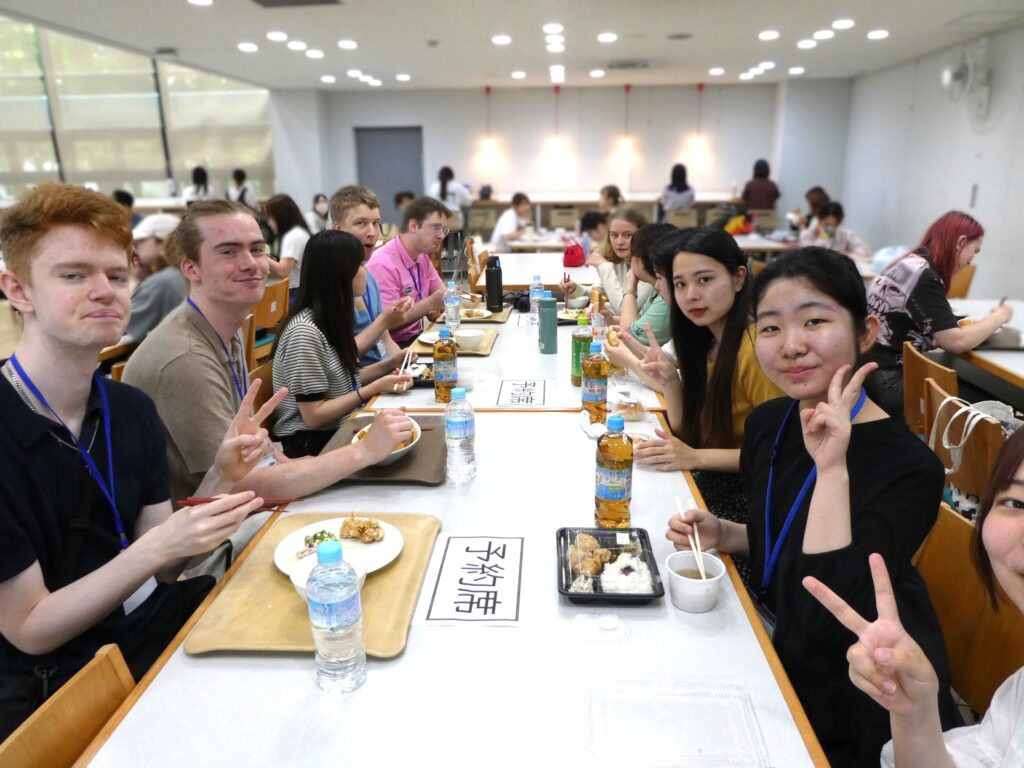 昼休みには、食堂で一緒に昼食をとり、より仲を深めることが出来ました。昼食後には、日本文化体験として、書道と、推しうちわ作りを行いました。書道では、好きな言葉や、自分の名前を漢字で書きました。日本人学生とWorld Campusの方が協力し、楽しむことができました。