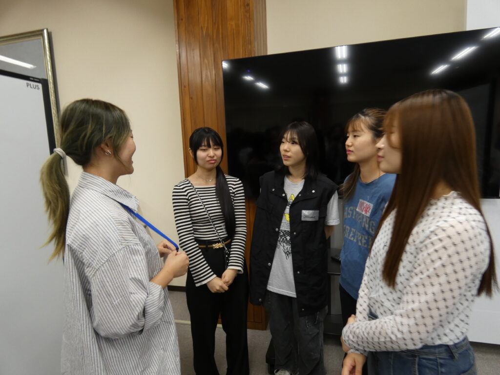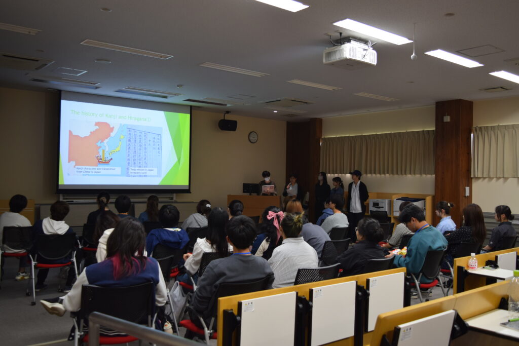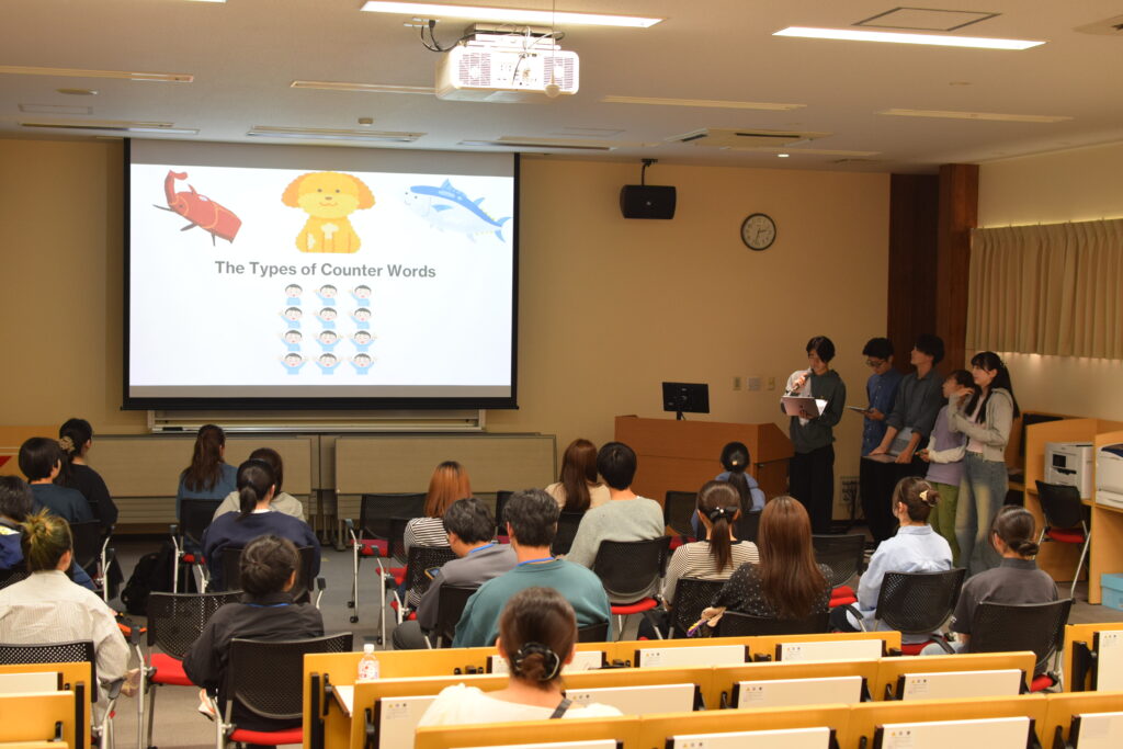 次に、英語英米文学科2年生の必修授業「Seminar for Core Subjects」 の受講生によるプレゼンテーションを行いました。3つのグループが日本語の数え方や同音異義語などを英語で説明し、クイズを出題して理解を確認しました。