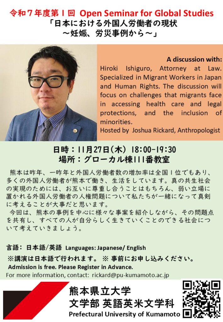 | 問合せ先 | rickard@pu-kumamoto.ac.jp(ジョシュア・リカード 文学部英語英米文学科准教授) |