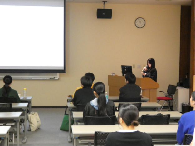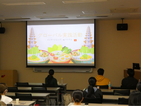 前半は、4名の留学経験者がそれぞれ、韓国の祥明大學校の交換留学、アメリカのモンタナ州立大学の交換留学、ベトナムでのもやいすとグローバルプログラムのインターンシップ、オーストラリアへの個人留学について発表しました。発表は、留学の動機や滞在先での生活、大変だったことや成長につながった出来事など、大変役に立つ内容でした。